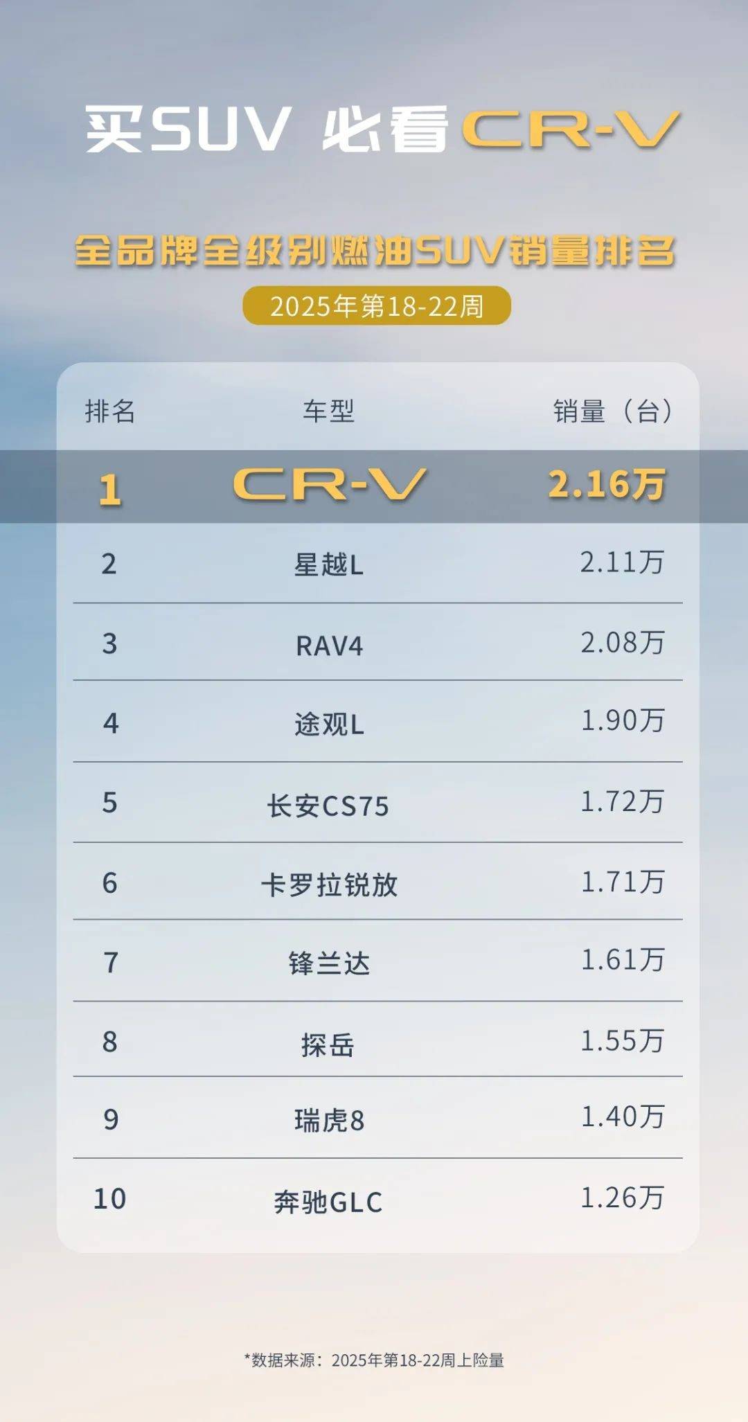 在电动化浪潮席卷全球汽车市场的今天,一款经典燃油车却以惊人的销量数据,向世界宣告了其不可小觑的实力。根据易车网最新公布的数据,在2025年第18至22周期间,东风本田CR-V在燃油SUV细分市场中,凭借2.16万辆的销量佳绩,成功超越吉利星越L和丰田RAV4荣放,登顶全品牌、全级别燃油SUV销量榜首,展现出其强大的市场号召力。